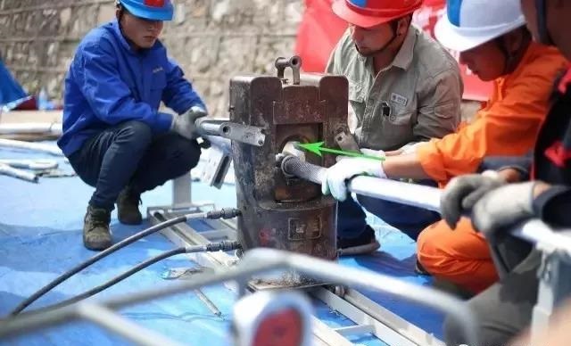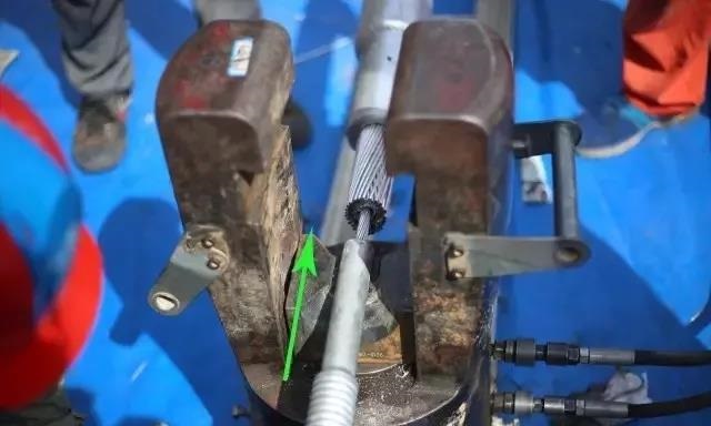 耐張鋁管必須執行:“倒壓”工藝。“倒壓”是相對于液壓規程SDJ226-87耐張線夾鋁管的壓接方向而言,指耐張線線夾鋁管的壓接順序是從導線側管口開始,逐模施壓至同側不壓區標記點,隔過“不壓區”后,再從剛錨側不壓區標記點順序壓接至鋼錨側管口。這種壓接方式可減少在鋁管管口處出現的“導線松股”情況發生,提高大截面導線液壓接續施工質量。(圖為耐張鋁管壓接過程1,綠色箭頭為施壓方向,耐張鋁管壓模規格為80mm)。