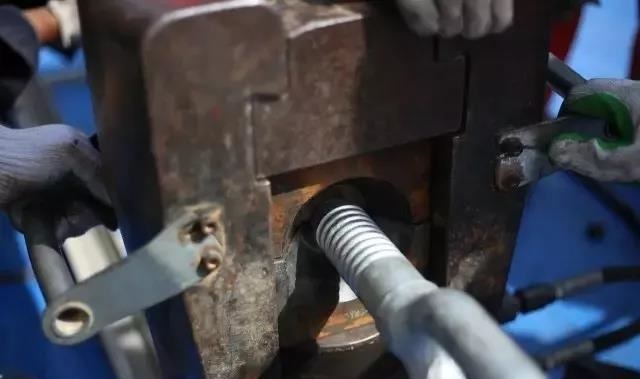 依據Q/GDW1571-2014標準,壓接管兩模重疊長度核心是減少壓接管彎曲發生,根據電科院最新研究成果,300噸壓接機鋁管壓接兩模長度以重疊25-40mm為宜。(圖為耐張鋁管壓接過程2)