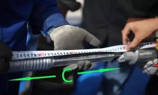 鋁管畫印:量取鋼錨圓環極限位置至鋼管壓后鋁線端頭的距離,并記錄該數值。【假設該值為C】。